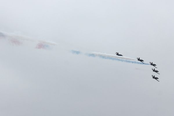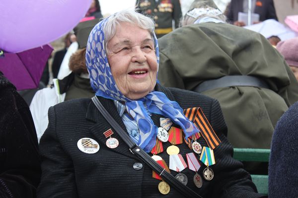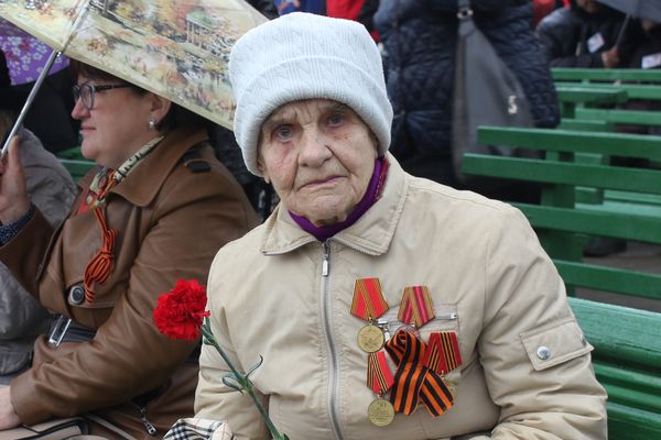 Затем ветеранов с праздником поздравила пилотажная группа «Русь», сделавшая два круга почета над площадью под аккомпанемент военного оркестра.