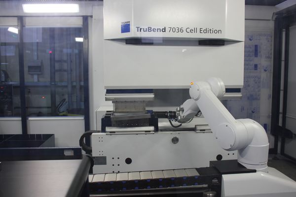 Раскроенные части шкафов попадают в цех, где листы загибают под нужным углом. Делают это как полуавтоматические машины, которые контролирует человек, так и робот. Специально для этого его модернизировали местные умельцы – убрали плоский «палец» и добавили такой, чтобы он мог удерживать согнутые листы металла.
