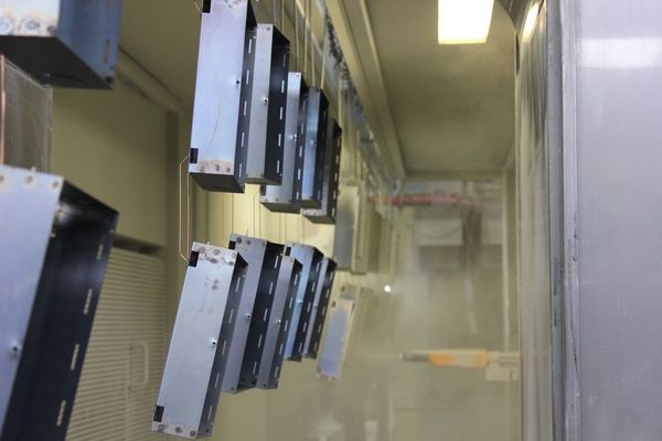Затем детали коробов складывают и сваривают на подобных роботизированных агрегатах. После чего шкафы попадают в покрасочный цех, где на них наносят порошок, и отправляют в печь для запекания краски.