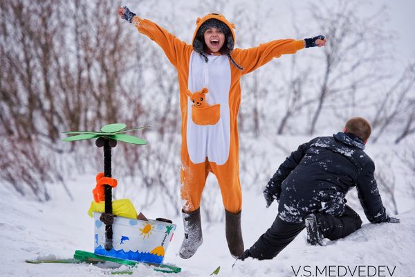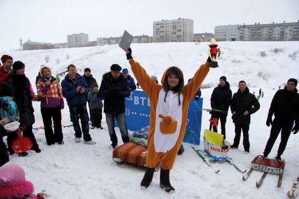 С индивидуальной креативной идеей для своего тарантаса «Каравелла» вышла на склон студентка Наталья Кузнецова. В костюме кенгуру девушка скатилась с горы в тазике с прикрепленной к нему пальмой.
