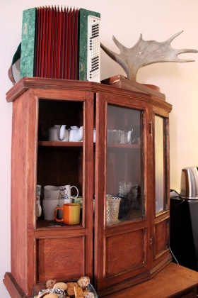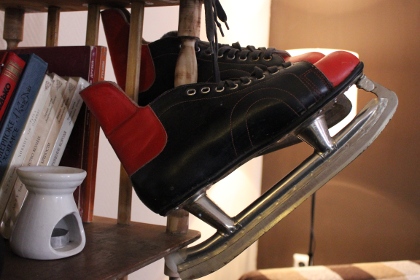 Эта комната выглядит несколько неуютной: стены выкрашены в холодный голубоватый цвет, расставлена очень разномастная мебель и наблюдается не слишком большое количество аксессуаров, создающих уют. Зато вторая комната — ее полная противоположность: теплый и мягкий свет, ковры, столы и стулья, изготовленные и древесины светлого оттенка, множество винтажных предметов — граммофон, аккордеон, старинные радио и фотоаппараты, советского вида телефон, часы с кукушкой и даже коньки.
