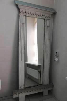 В туалете помимо винтажных сундуков и видавших виды шкафчиков стоит зеркало, вставленное в наличники для окон
