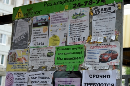 Но есть реклама, которая часто отталкивает потенциального покупателя. Рваные, грязные, размокшие объявления в хаотичном порядке расклеены на остановках. Такие реклама, возможно, и приносят некую пользу потребителям, но в большинстве своем портят внешний вид города. Стертые объявления многослойными рядами навешаны и на других городских сооружениях: столбах, заборах, стенах магазинов. Предпринимать какие-либо действия бесполезно, ведь поймать за руку незаконных расклейщиков невозможно.