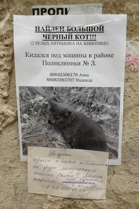 Ко всему выше перечисленному можно добавить объявления о том, что пропала или нашлась кошка, а также народилось много котят и всем им нужен новый дом. Это могут быть объявления о находке или пропаже документов, денег, ключей. Они редко имеют отношение к материальной выгоде (хотя может быть вознаграждение), но свои пять копеек в общее заклеивание Сыктывкара вносят.
