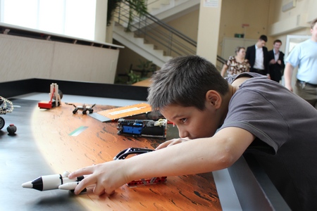 По периметру площадки разместились проекты школьников и их руководителей. Полезность и разнообразие созданных роботов поражали. Первоклассник Денис рассказал, что он вместе с братом создал робота-умника, который помогает выучить правильное написание словарных слов. Сначала братья сами на бумаге пишут сложные слова, затем их пишет робот, после оба варианта сверяются и дети узнают, где допустили ошибку.