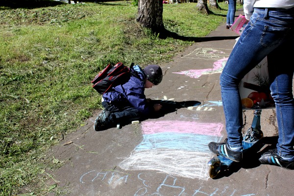 Под музыку, сидя за мольбертами или ползая на коленках по асфальту, творили юные творческие личности.