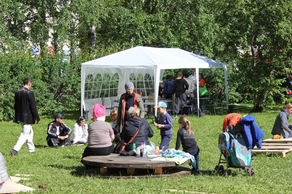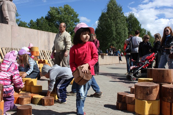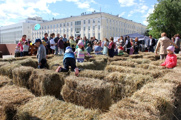 Посреди площади расположился бассейн с сеном, в нем резвились дети. Взрослые, которым надоедало снимать на телефоны резвящуюся малышню, могли обратить внимание на сцену. На ней постоянно что-то происходило: пели различные коллективы, проходили показы коллекций этнической одежды, рассказывалось об интересных с туристической точки зрения уголках Коми.